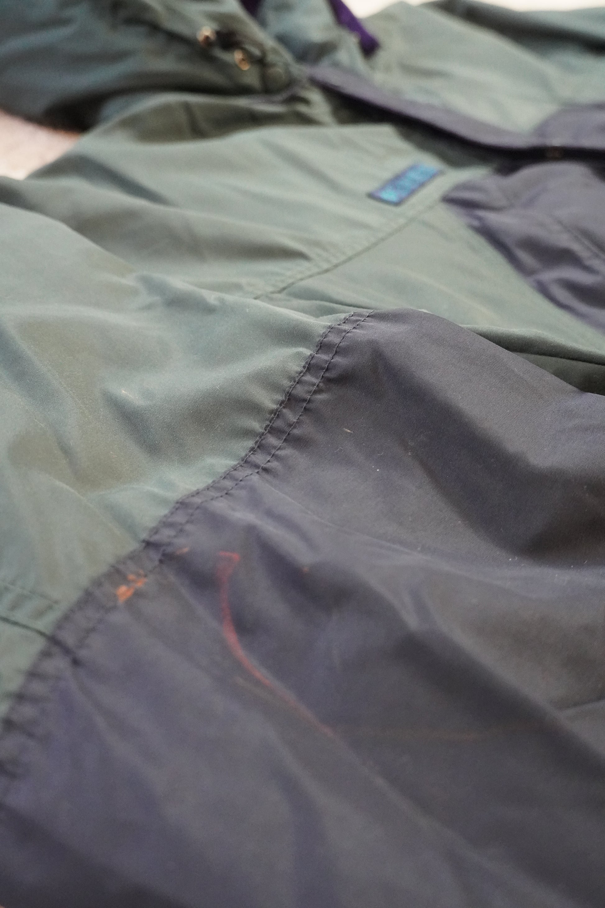 good condition, blemishes shown in last photo, detachable hood, fleece lined neck, water resistant